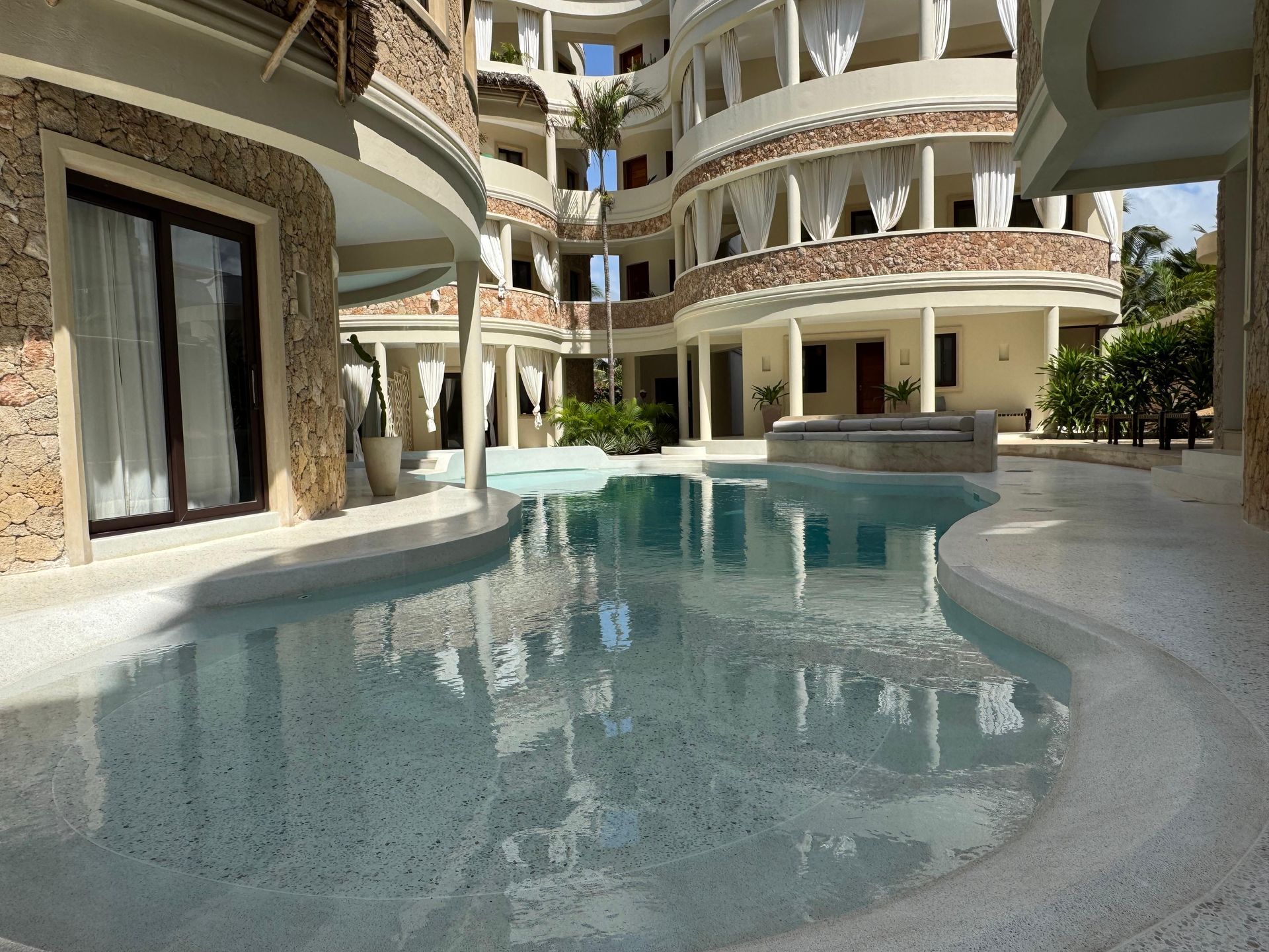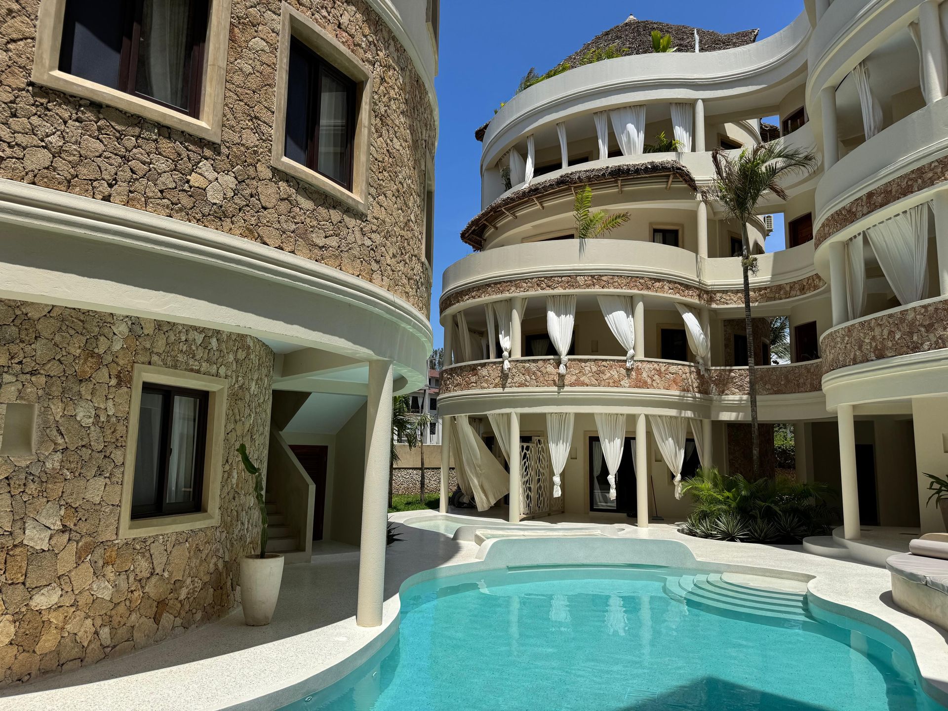 Ghepard Tower is a unique residential complex with a stunning ground level swimming pool and rooftop pool offering breathtaking panoramic views of the ocean and surrounding landscape, few metres from the beach providing a serene escape in the heart of paradise.